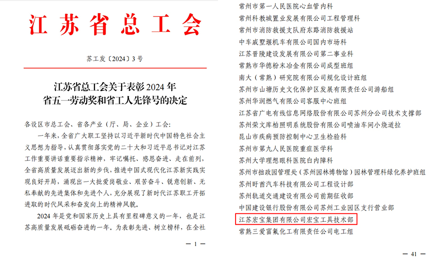 | 日前,江蘇省總工會(huì)發(fā)布關(guān)于表彰2024年省五一勞動(dòng)獎(jiǎng)和省工人先鋒號(hào)的決定,江蘇宏寶集團(tuán)有限公司宏寶工具技術(shù)部光榮上榜! |